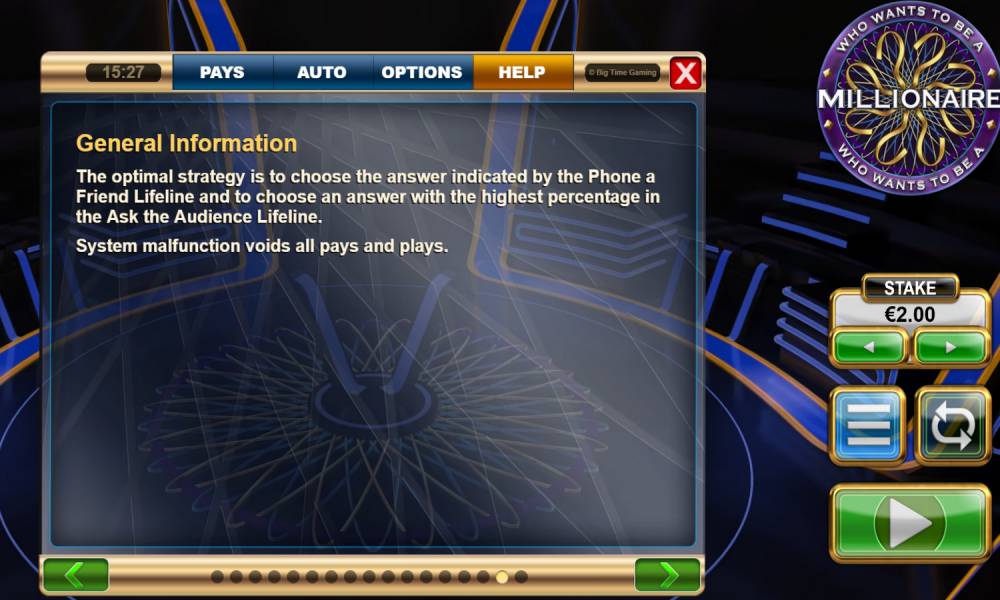 Finding a honest casino to play Who Wants to be a Millionaire Megaways can be done on your own, but you will have to spend time searching. There is no guarantee that the gambler will not end up with scammers - because slots from Big Time Gaming can add and sites with a bad reputation. Play in already proven casinos so that you don't make a mistake and don't risk money and personal data.