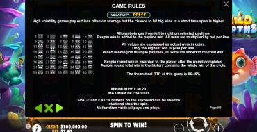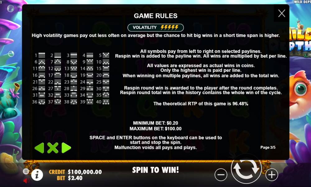 The Wild Depths slot machine from the Pragmatic Play provider has a standard playing field, consisting of 5 reels with 4 symbols. Payouts are made on 40 lines.