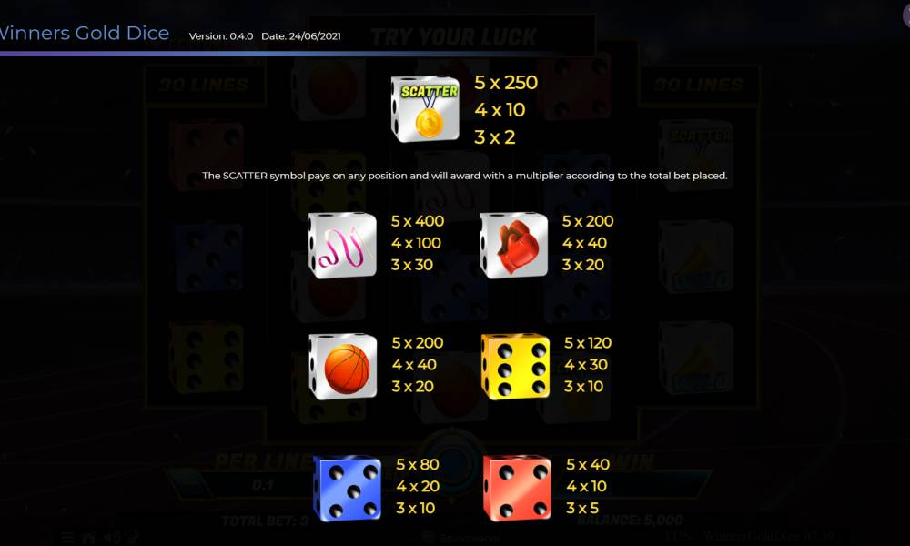 The Winners Gold Dice slot machine from the Spinomenal provider has a non-standard 3-4-4-4-3 playing field. Payouts are made on 30 lines.