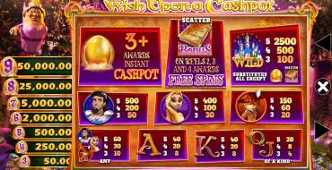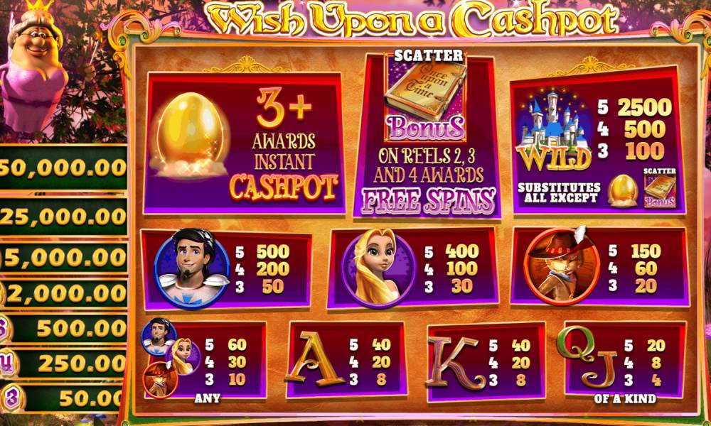 The playing field of Wish Upon a Cashpot consists of 5 reels with 3 rows each. Winning chains are formed from the left edge to the right edge. Payment is made for three or more of the same symbol. But there is an exception - the prince, princess and the cat in boots (that is, any of these signs) can also give a reward. This trio are the older symbols. But the 4 younger symbols are paid only for identical images. There are 20 fixed payout lines in the game at all times. Bonuses of the slot are represented by instant cash payouts, additional addition of special signs on the field and freespins. All this helps to get large prizes, up to x50000 from the bet, the range of which is 0.1-50 euros.