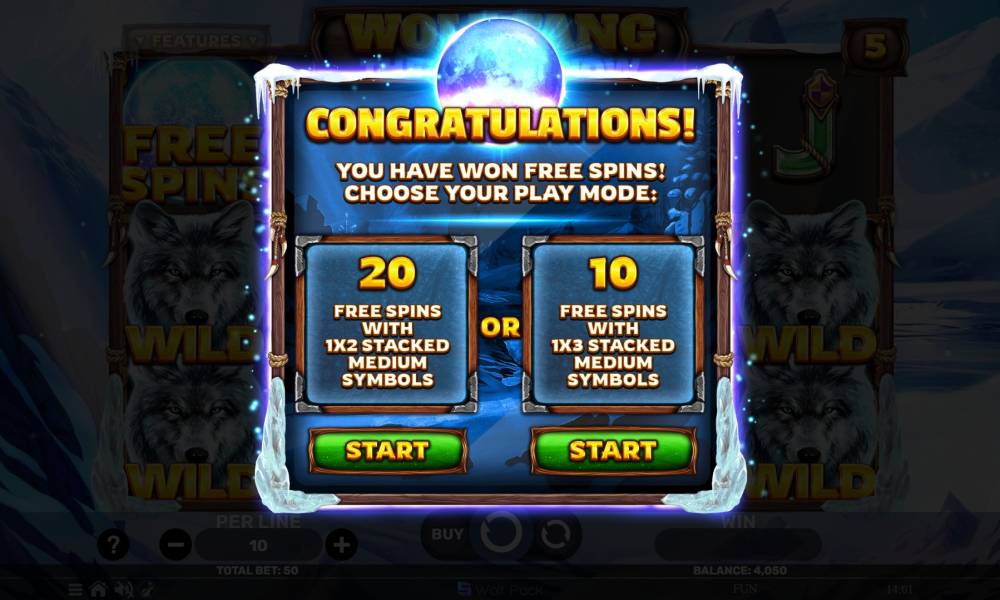 The Wolf Fang - The Wild Snow slot uses a classic 5x3 game grid, with fixed 5 lines. Winning combinations are formed according to the standard rules - from left to right, starting with three identical symbols in a row. The size of the bet is determined by the player in the range from 0.05 to 50 euros. Often casinos change the maximum value to suit their clientele. The slot machine offers several bonus features, including freespins, Stacked Symbols, as well as Bonus Picker mode. Buy Feature is also present. In total, the game features 9 regular and 2 special symbols, which help to increase the chances of big wins. Payout odds in the slot are increased, as the game has few lines and a low limit bet.