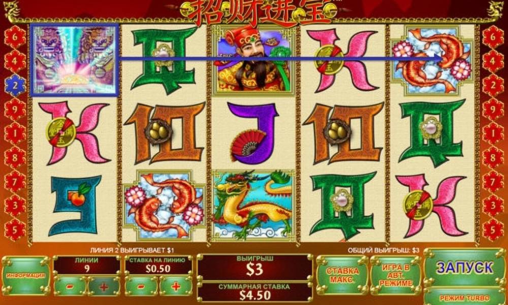 Zhao Cai Jin Bao - five-reel video slot with nine lines and three rows of pictures on the screen. Play the slot machine is allowed to play on any number of active lines of nine, putting on each of them from one cent to one hundred dollars. On the spin is accepted up to nine hundred dollars (Winner Casino example).